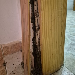 Op vrijdag stond er een bezoek aan ITV in Elche op het programma om daar de invoer van de auto in gang te zetten. Net voordat ik aan wilde rijden deed Astrid een ontdekking op de benedenverdieping. Bij het opzij zetten van een (achteraf waarschijnlijk tactisch geplaatst) rekje met Spaanse filosofieboeken kwam een gat in een kozijn naar voren wat we bij de verschillende bezichtigingen nooit gezien hadden. Astrid zag al meteen dat het ging om termieten en toen we de andere deurkozijnen op de