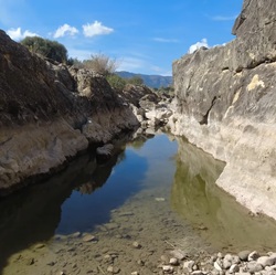 Kleine hagedissen zonnen zich op stenen muurtjes en paden, terwijl salamanders en kikkers verscholen blijven in de vochtige kreken en bij de rivier de Gorgos die door de vallei