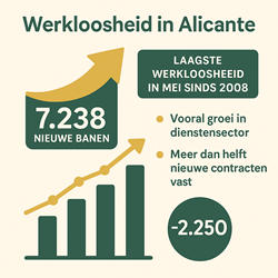 De arbeidsmarkt in de provincie Alicante heeft in mei een opvallend positieve wending genomen. Voor het eerst in jaren lijkt er sprake van niet alleen herstel, maar ook van echte groei. In de afgelopen maand werden er ruim 7.200 nieuwe banen gecreëerd en daalde het aantal geregistreerde werklozen met meer dan 2.200 personen. Daarmee bereikt de provincie het laagste werkloosheidscijfer sinds het uitbreken van de economische crisis in 2008. Goed nieuws dus – niet alleen voor de lokale bevolking, maar ook voor Nederlanders en Belgen die hier wonen of overwegen naar deze regio te emigreren.
